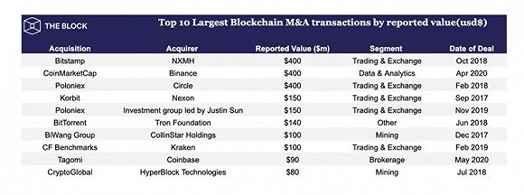 到目前为止,区块链行业里至少有三家公司以4亿美元的报告价值被收购,分别是NXMH收购Bitstamp、币安收购CoinMarketCap、以及Circle收购Poloniex。