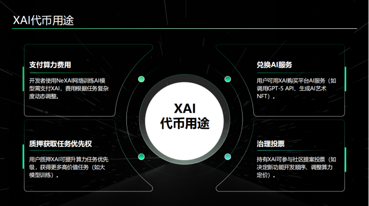 作为生态内的关键媒介,XAI在算力交易、任务质押、AI服务兑换等多个环节发挥重要作用。此外,NeXAI设有去中心化自治组织(DAO),XAI持有者可参与社区治理及决策,进一步增加了XAI的战略意义与投资吸引力。平台在AI医疗、自动驾驶及气候预测等领域的不断拓展,使得XAI的应用场景愈加广泛,长期需求稳步提升。